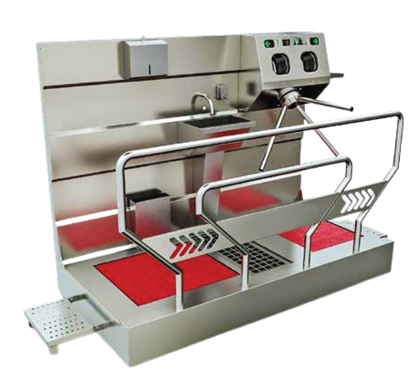 Na wyposażeniu znajduje się umywalka umożliwiająca dokładne mycie rąk, strefa czyszczenia obuwia za pomocą mat higienicznych oraz moduł dezynfekcji dłoni. Po wykonaniu pełnej procedury dezynfekcji możliwe jest przejście przez podwójny moduł kontroli dostępu.